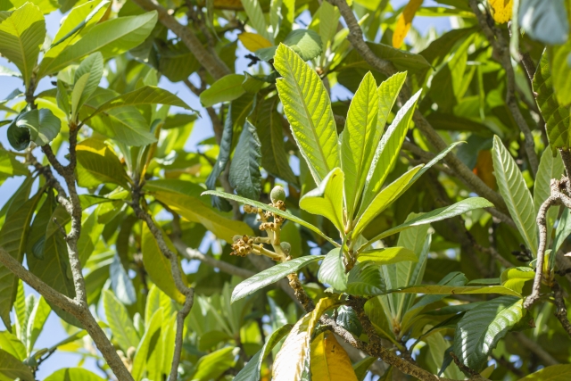 枇杷は成長スピードが早く、放置すると高さ5〜10mほどまで大きくなることがあります。葉は大きく厚みがあり、年間を通して落葉が少ないため目隠し効果もありますが、その分、枝葉が密集しやすい傾向があります。